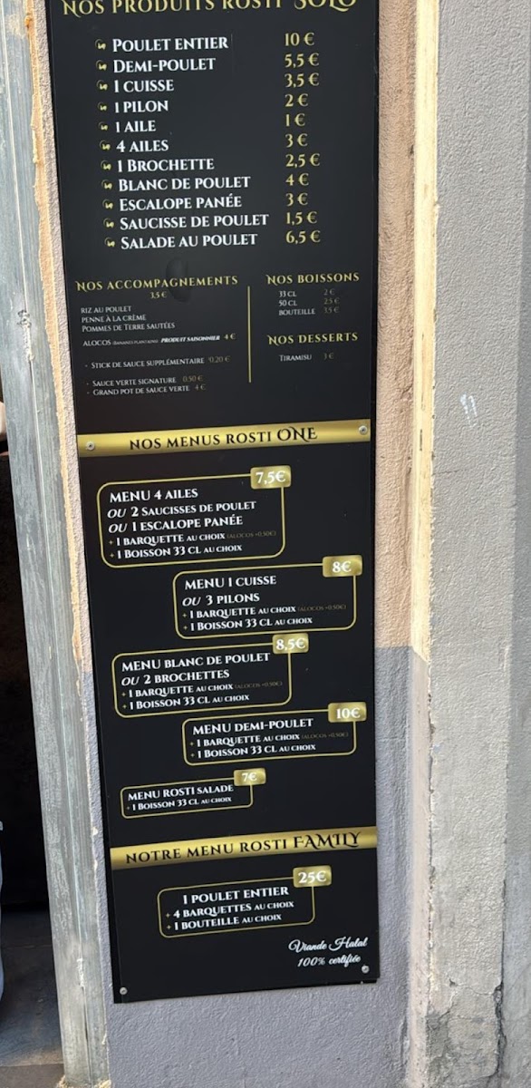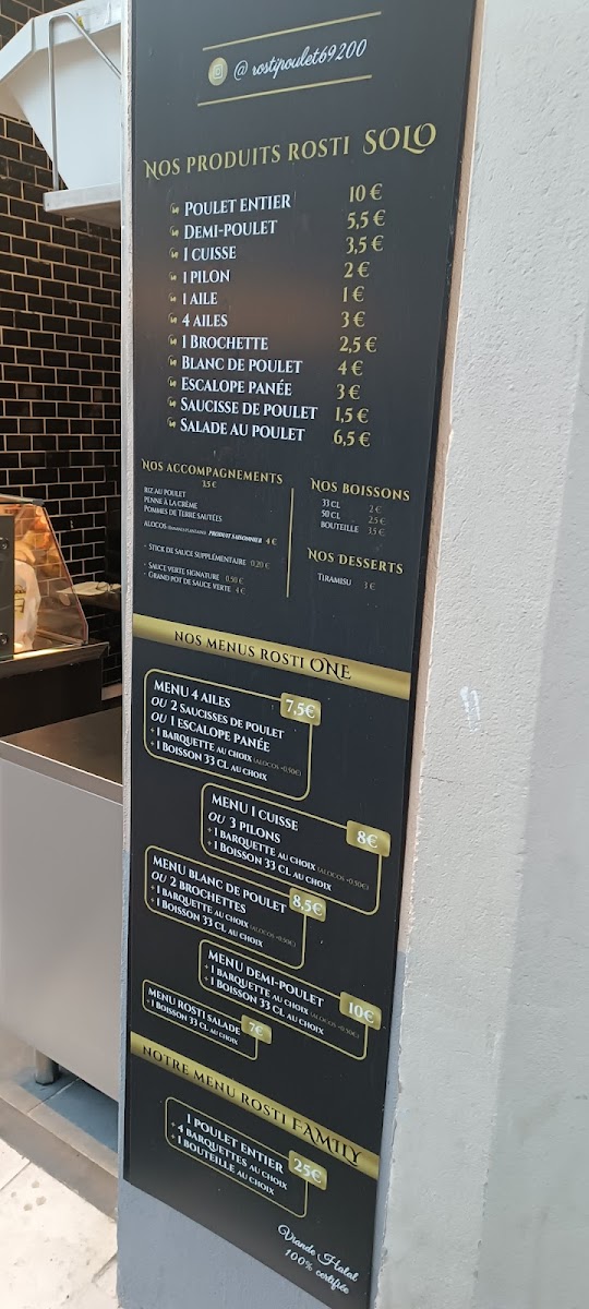 Their Menu ROSTI features choices like crispy chicken thighs, tender chicken legs, and savory chicken wings, all seasoned with their signature rosti poulet spice blend. You can also opt for classics like chicken escalope milanese or chicken sausages, paired with a side dish and a refreshing 33 cl beverage of your choice.